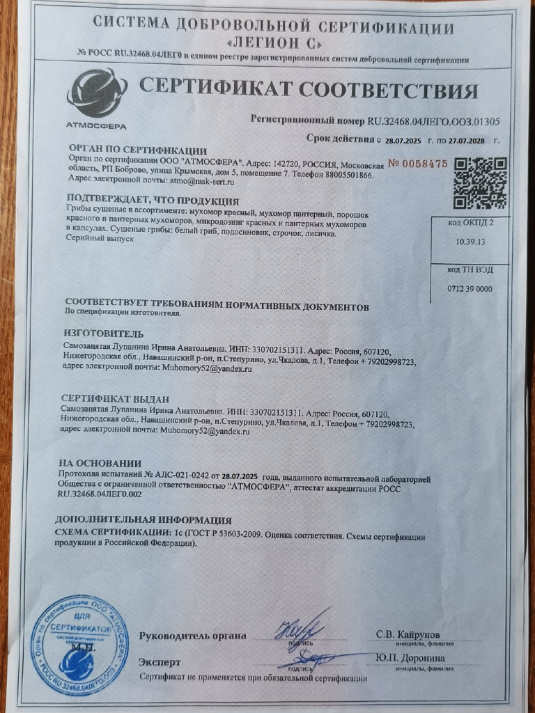 Сбор осуществляется в экологически чистых лесах Нижегородской области. Электросушка проводится в шкафах при температуре 35 °С в щадящем режиме — все целебные свойства сохранены. Многолетний опыт исключает вероятность сбора некачественных грибов. Весь товар сертифицирован.